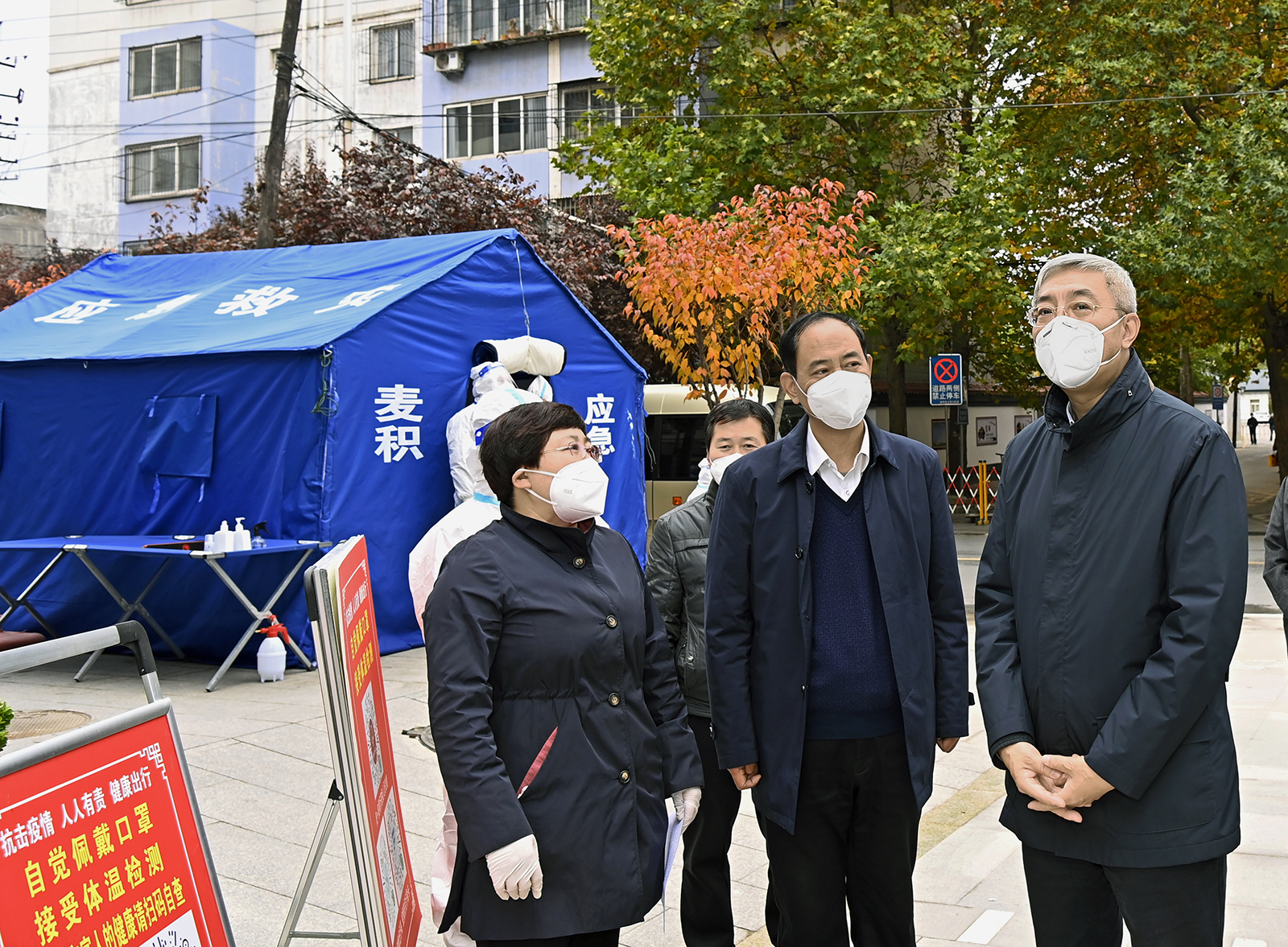 省委书记、省疫情联防联控领导小组组长尹弘11月4日在天水市调研督导疫情防控工作,看望慰问一线工作人员。他强调,要深入贯彻习近平总书记关于疫情防控的重要指示精神,认真落实孙春兰副总理在我省调研时的讲话要求,增强大局意识和全局观念,压紧压实各方责任,从严从细筑牢坚固防线,确保在最短时间内有效遏制疫情蔓延。